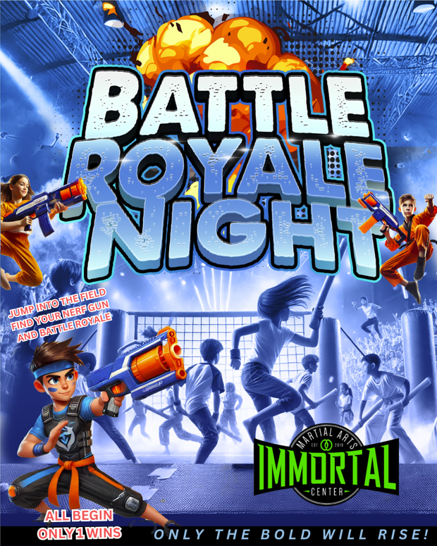 Battle Royale is a fun, high-energy Parents Night Out event where kids engage in martial arts-themed games and team challenges. This three-hour event includes themed physical activities, pizza and juice for dinner, and supervised downtime to ensure safety and enjoyment.